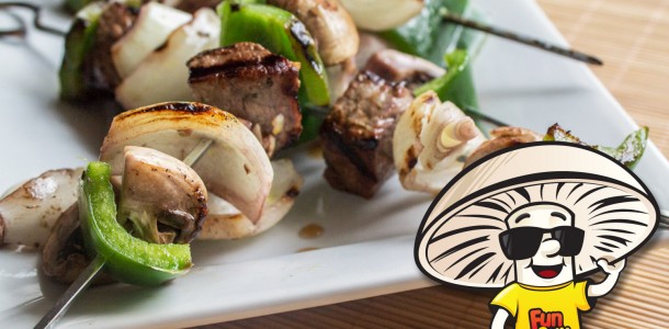 Those smokey smells of grilled meat and veggies have been invading our minds all month long, so you know what? Let’s grill it up today with some kabobs. Sweet and tangy red wine and honey marinated kabobs with with beef, bell peppers, onions, and FunGuy mushrooms. Here we go!