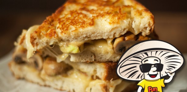 - Assemble sandwich by layering bread, 2 slices of cheese, avocado, mushroom caps, another 2 slices of cheese and top with bread.