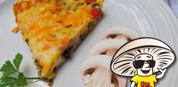 This is a simple mushroom frittata recipe with eggs, Mexican cheese, jalapenos, tomato, corn, cilantro and FunGuy Mushrooms. It’s super versatile (substitute any of the ingredients; except the mushrooms – they are required!); frittatas work for breakfast, lunch or dinner.