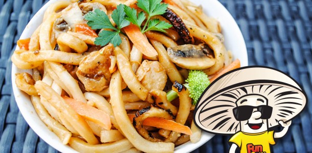 These yummy noodles with a caramelized soy glaze are worth slurping. Dotted with FunGuy white button mushrooms, fresh veggies and sautéed chicken – their garlicky goodness will leave your family begging for seconds.