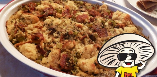 Oh Thanksgiving, you’re so cute! The way you raise everyone’s culinary expectations, then make us to cook a meal for 300 people using a two burner stove… it’s adorable. But this year we’ve got your number. This year we are thankful for FunGuy Mushrooms, which we will use to make a stuffing so delicious, so divine, no one will grumble and order pizza.